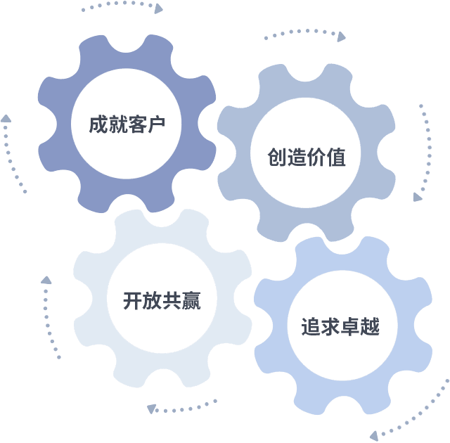成就客户是一切决策的出发点,,,创造价值是衡量所有工作的标准,,,追求卓越是我们做事做人的态度,,,开放共赢是我们的格局也是最终的结果。。。价值观的齿轮环环相扣,,推动着组织里的每个人不断向前。。。