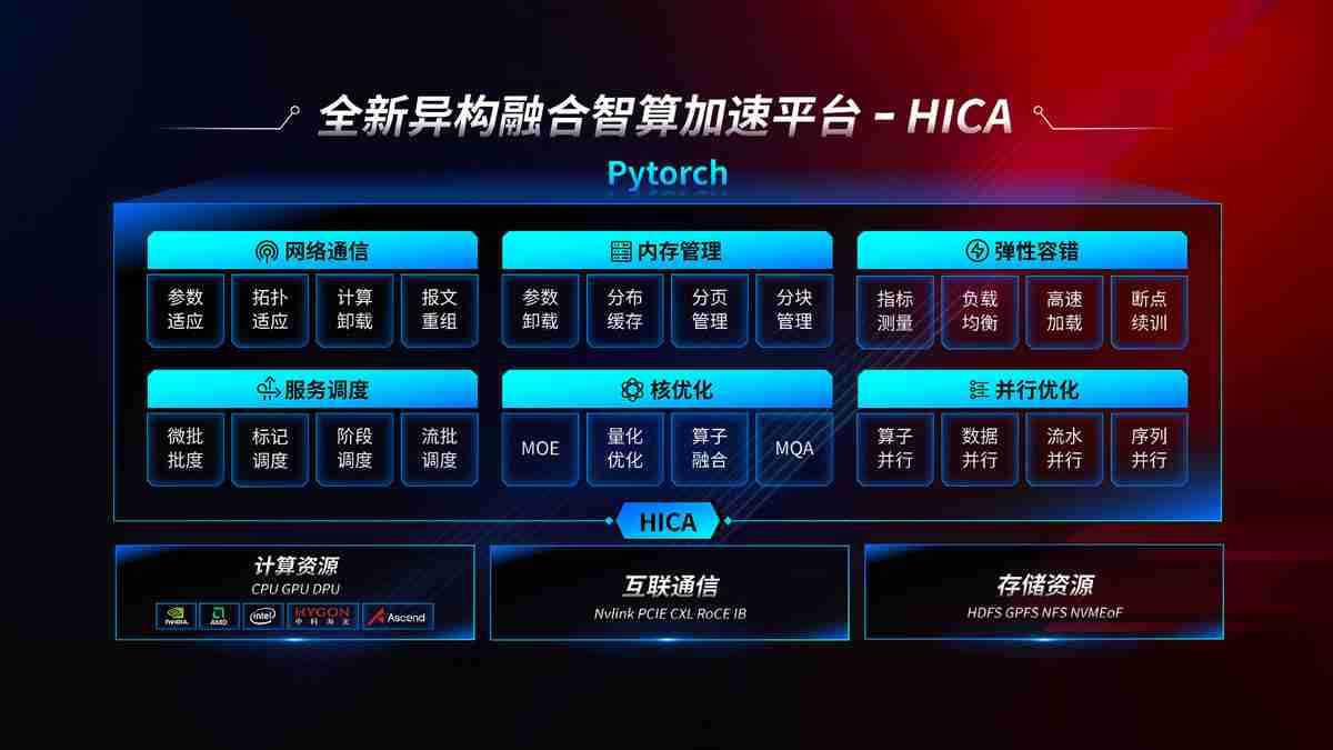 通过自研的服务层、、、中间适配层、、、、以及调度编排算法,,,,采用数据并行、、模型并行等多种并行方式,,,,把并行计算任务进行有效的分解,,,使其分别由相应的软件栈和算力资源来承接。。。当GPU资源变化,,HICA可以实时动态调度计算子任务并调整模型拓扑和架构,,以充分聚合各种算力资源。。。