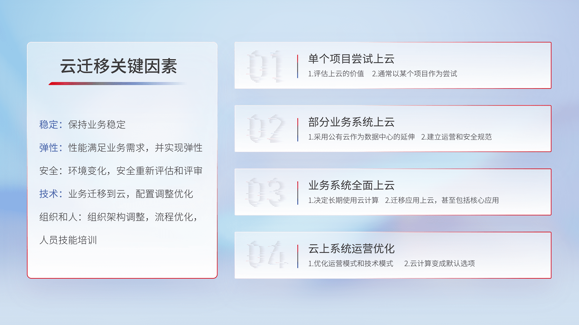 结合实际业务,,,从规划设计、、、云平台选型、、、云原生改造、、、、数据迁移、、、集成交付,,,,迁移全过程为客户识别最佳上云路径,,,做好风险识别管理,,设计网络架构、、、身份权限、、安全审计合规、、操作审计、、、日志审计、、、监控告警策略、、多站点容灾设计等,,对云上基础设施进行整体规划,,提升IT治理水平,,,以满足弹性、、、、高可用、、高性能的需求。。