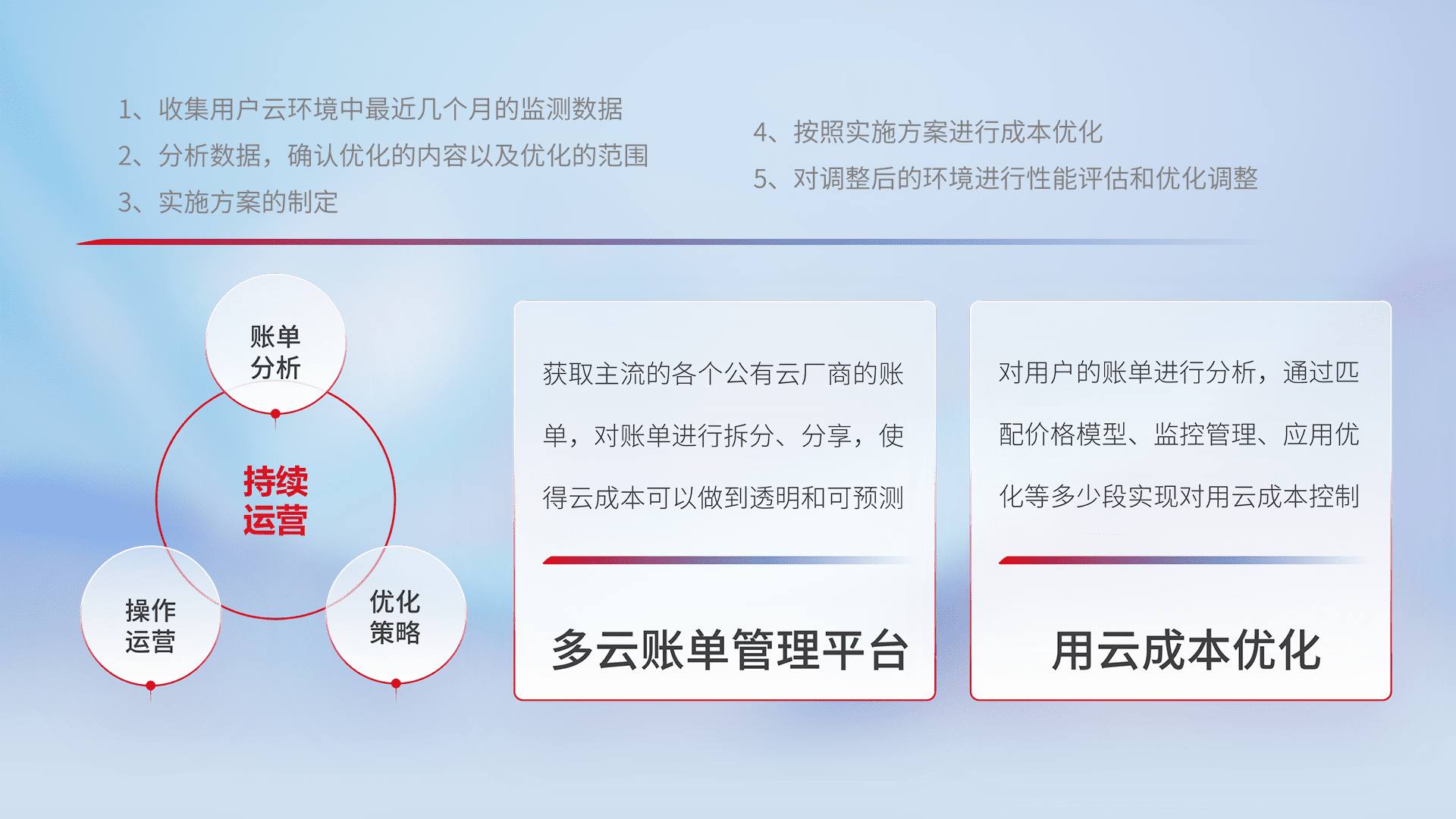 通过多云纳管,,,,以统一的资源数据模型把客户的云资源进行抽象和封装,,,,进而实现对多云资源的统一操作,,,,保障云资源管理的可靠性、、稳定性与可用性。。。。量身定制化运维内容,,配置、、开发运维、、、补丁管理、、、备份、、、、监控、、、认证和访问管理、、、、审计和日常巡检等,,保障在用云过程中的可靠度,,,,稳定度以及高可用率。。。