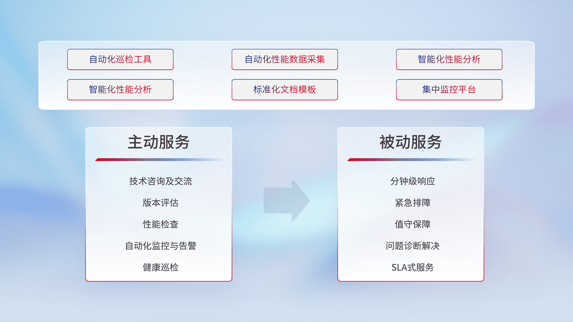 智能化工具和标准化文档,,保障服务质量,,,,提供主动服务(包含技术咨询、、、版本评估、、、性能检查、、、自动化监控与告警、、、健康巡检)和被动服务包含(分钟级响应、、、、紧急排障、、值守保障、、问题诊断解决、、、、SLA服务)。。