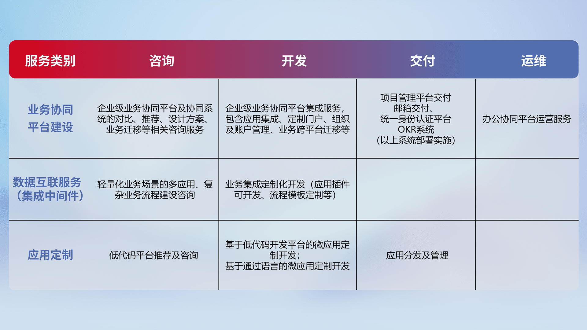 针对钉钉、、、企微、、IDaas等平台级产品提供产品的规划、、方案、、、交付、、、定制化开发等服务,,,,实现如统一协同办公、、、、智能客户服务、、混合会议管理、、智能数据查询、、、、等业务场景,,实现数字化转型。。。。